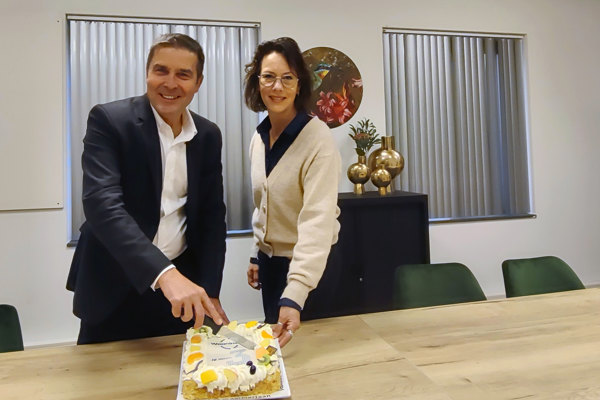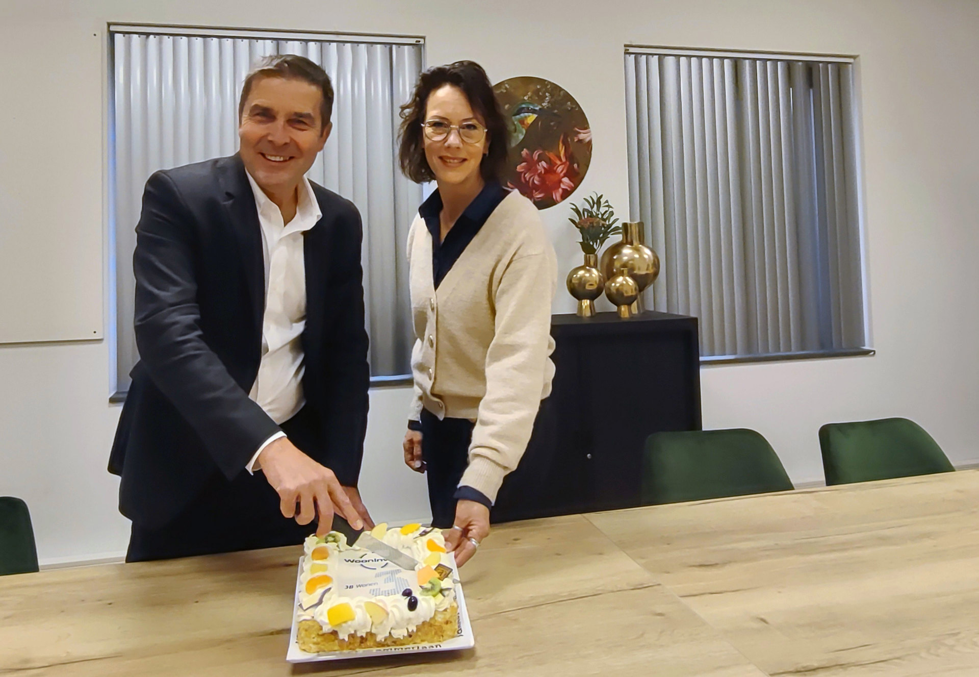 Hanneke Vliet Vlieland (3B Wonen) en Peter van Heeswijk (WoonInvest) bekrachtigen met het doorsnijden van de taart met beide logo’s symbolisch de verkoop.