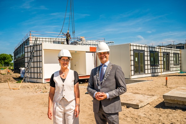Hanneke van Vliet Vlieland, directeur-bestuurder van 3B Wonen (links) en burgemeester Pieter van de Stadt voor enkele flexwoningen op de locatie Sporthoeklaan in Bergschenhoek.