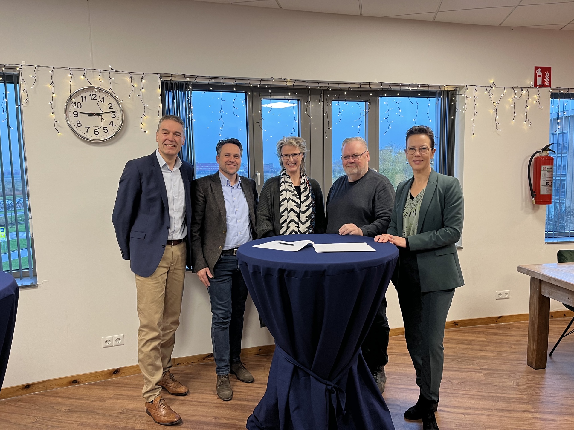 Bart Kesselaar, directeur Strategie van Havensteder, Michiel Muis, Wethouder van gemeente Lansingerland, Bianca van Buren, Bestuurslid sociale leefbaarheid, Jacques van Schaik, Voorzitter van de Huurdersvereniging Lansingerland en Hanneke Vliet Vlieland, directeur-bestuurder van 3B Wonen ondertekenen de prestatieafspraken.