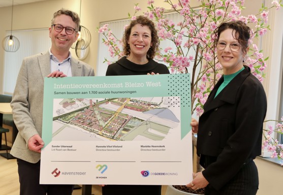 De woningcorporaties 3B Wonen, De Goede Woning en Havensteder ondertekenden maandag 9 februari een intentieverklaring om samen ongeveer 1.700 sociale huurwoningen te realiseren in Bleizo-West. Zij zetten hiermee een volgende stap in de samenwerking die tijdens de startbijeenkomst op 11 november 2025 werd afgetrapt. De drie corporaties dragen zo gezamenlijk bij aan de ontwikkeling van een mooie, toekomstgerichte wijk waar mensen betaalbaar en prettig kunnen wonen.