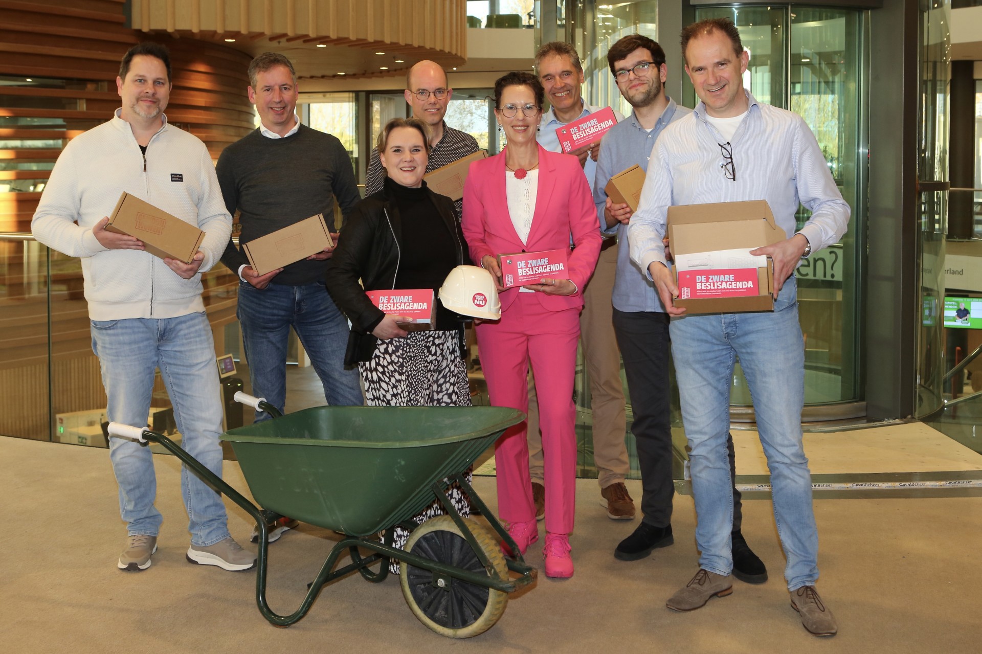 De agenda is letterlijk en figuurlijk zwaar. Aan elke agenda zit een baksteen vast. Dat is een bewust gekozen symbool. Het laat zien dat praten alleen niet genoeg is. Er zijn beslissingen nodig, en daarna daden.